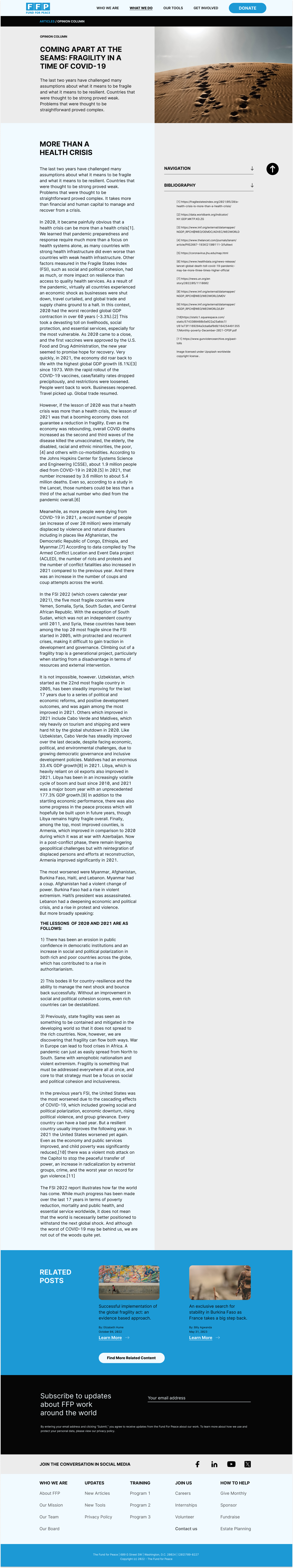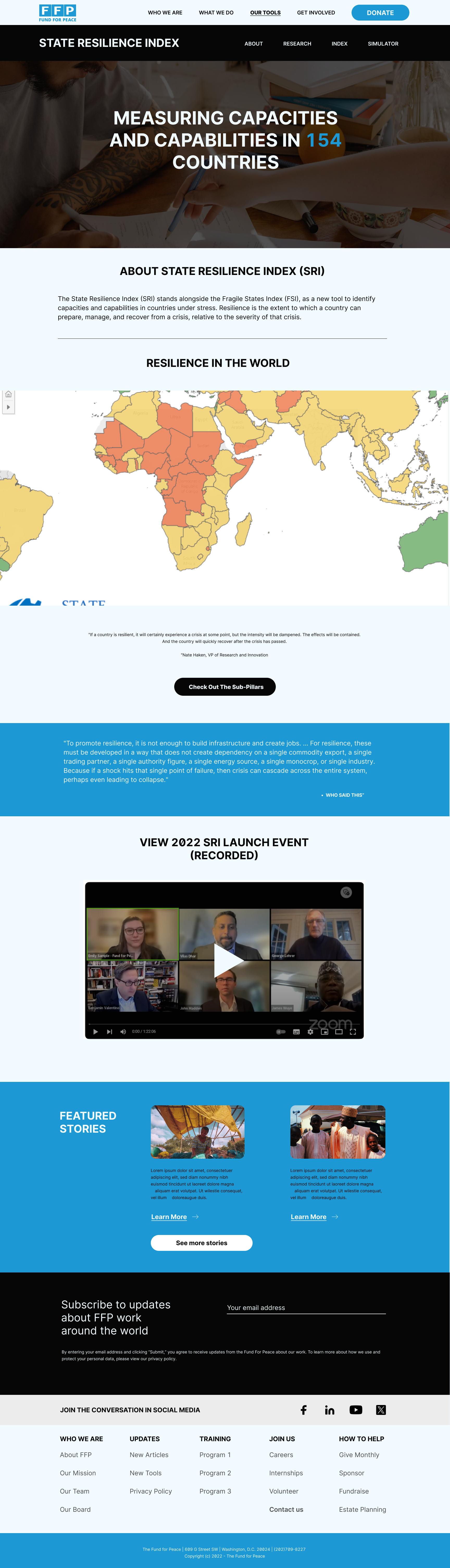 FFP's new initiatives feature different branding and navigation, with some hosted outside the main URL. To simplify adding new projects, they created separate websites and linked them to the main site. However, this approach caused confusion, as the inconsistent designs led users to think the State Resilience Index and Fragile States Index were from different organizations. The solution was to redesign the homepage alongside the State Resilience Index homepage, creating a unified look across both.