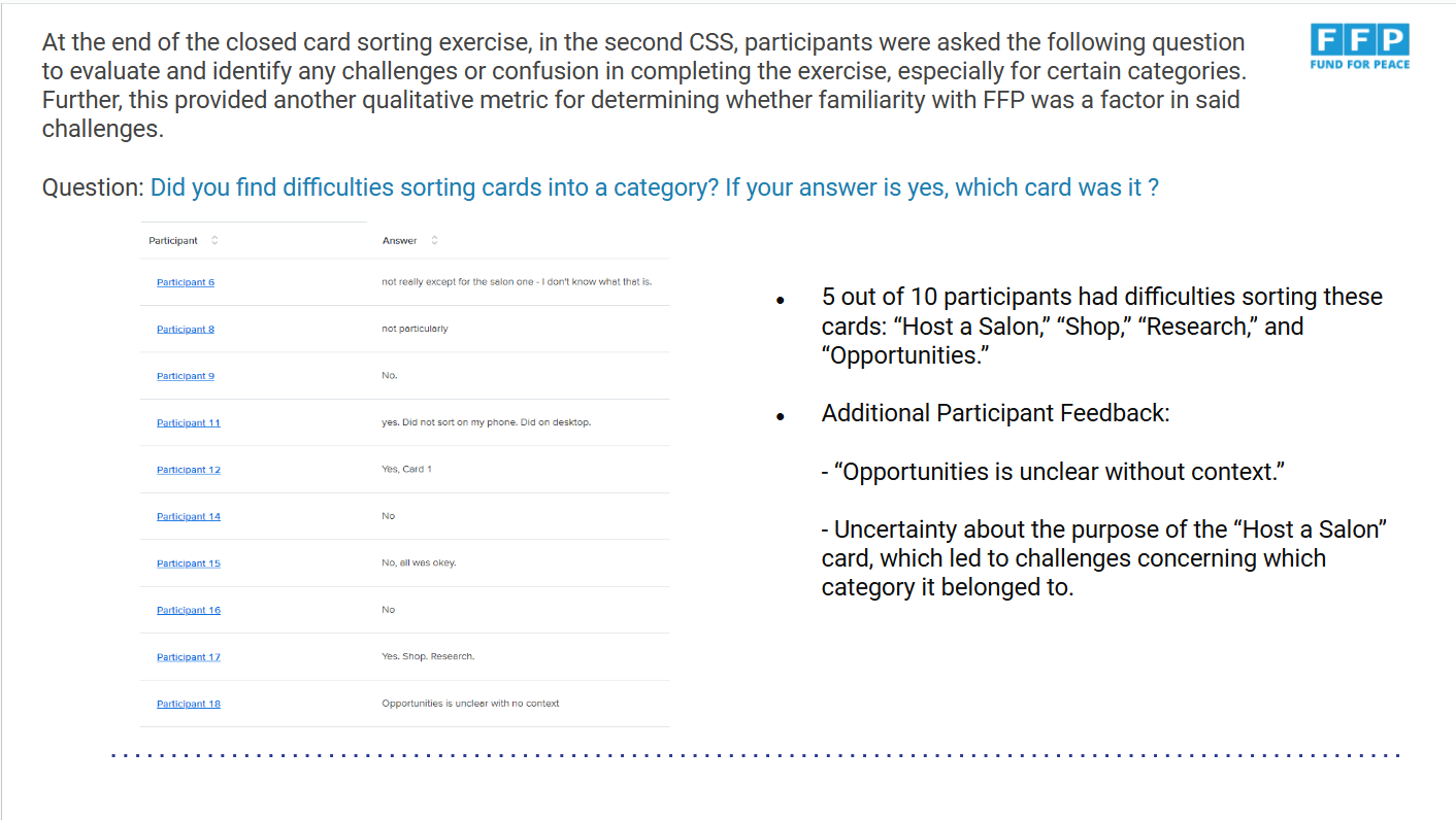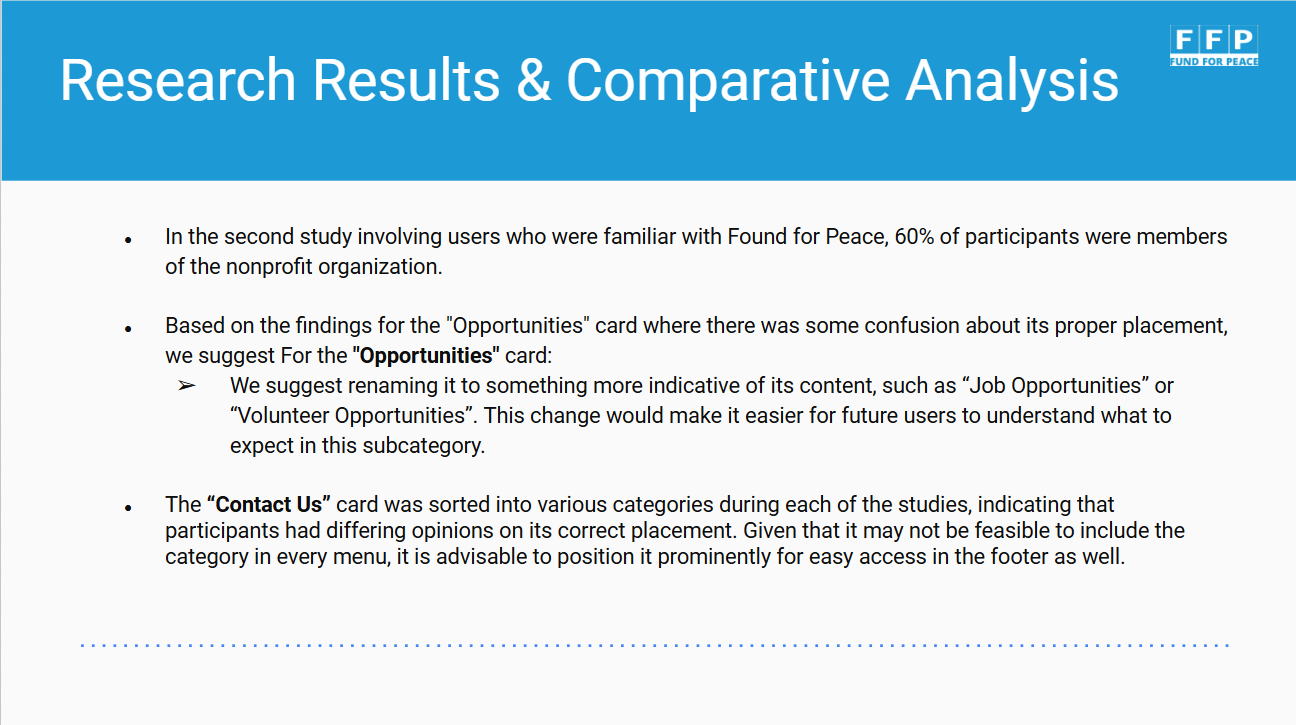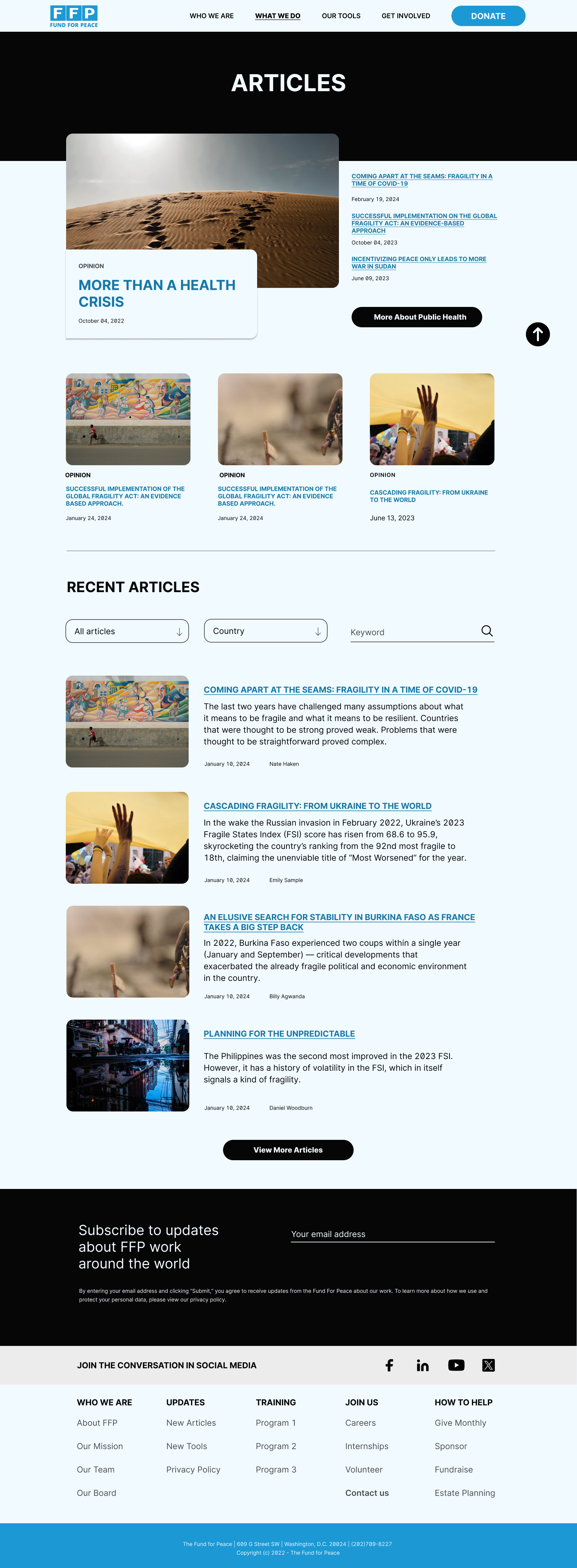 The Fund for Peace has not updated its website since the early 2000s, resulting in a poor and confusing user experience. Visitors often struggle to navigate the site and fail to achieve their objectives. Additionally, there is a common misunderstanding about the organization's mission—many users mistakenly believe that the Fund provides financial aid, when in fact, it seeks donations and support to continue its peacebuilding operations.