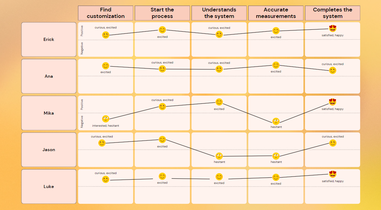 The interviews were conducted via video calls, with users receiving a link to access the prototype. They were instructed to simulate the role of potential buyers interested in custom shoes and discuss their thought process. I observed the process without interfering. Subsequently, each user was asked to provide feedback on their experience.